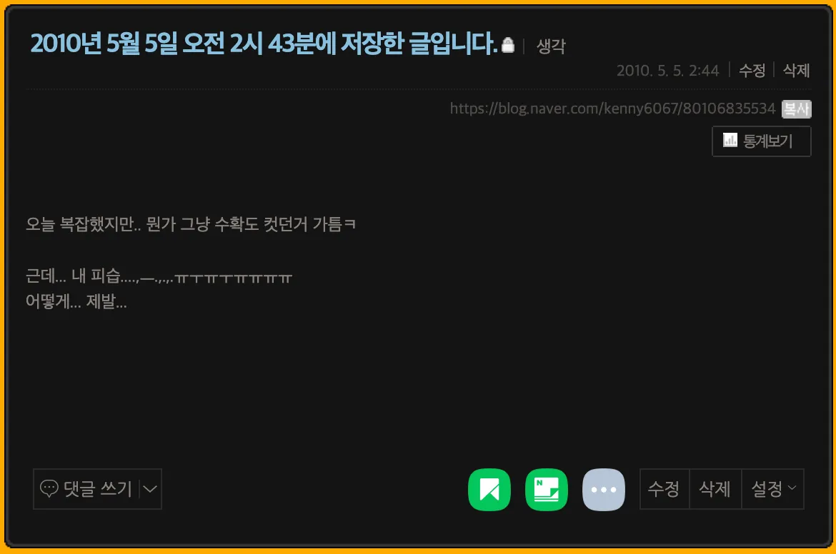 문득 옛날에 만들었었던 네이버 블로그에 오랜만에 들어가봤다. 2010년 5월 5일에 나만 보기로 작성한 첫 글이 있었다. 시작일을 기준으로 하면 15년만의 블로깅이다. 그 때는 왜 블로그를 시작했을까? 잘 기억이 나지는 않는다. 초등학교 때 선생님이 억지로 시켜서 쓰던 일기를 제외하면 한 번도 스스로 일기를 써본적이 없다. 산발적인 아이디어를 노트에 기록하는 것이 개인적인 글쓰기에 전부였다. 고등학교에 들어가서 온갖 레포트를 제출 마감일 자정을 넘어서야 시작하는 스트레스에 고통 받기도 했지만, 내가 썼던 글을 나중에 다시 읽으면서 글쓰기에 나름 즐거움을 느낀다는 것을 깨달았다. 2025년 새해를 맞으면서 오랬동안 머릿 속으로만 하고 싶었던 글쓰기를 더 일상적으고 의도적으로 해보고 싶다는 생각이 들었다. 회사 동료인 H를 보면서 그런 생각이 더 공고해졌다. 생각도 많고 대화도 좋아해서 모든 것과 모든 생각에 항상 나름대로 의견이 있는 사람이지만, 나만이 가지고 있는 반복되고 일관적인 "관점"이 있는지 문득 의문이 들었다. H는 신중했지만 항상 명확한 관점이 있었다. 그래서 내가 가졌던 생각들을 더 많이 기록하고 그것들을 연결하고 가다듬어야겠다고 다짐했다. 관종이자 게으른 완벽주의자여서 인스타그램을 하는 것도 그만두었다. 무언가를 올리기위해서는 너무 많은 고민을 했지만, 막상 올리고 그것의 좋아요 수나 댓글 수를 신경쓰게 되는 내 자신이 싫었다. 하지만 아무도 보지 않을 것이라는 생각으로는 완결성 있는 무엇을 만들어낼 동력이 생기지도 않았다. 그래서 블로그를 선택했다! 누구든지 볼 수있는 공간에 쓰지만, 아무도 관심을 주지 않아 좀 더 편하게 내 생각을 적을 수 있는 공간. 완결성 있는 글을 써야한다는 압박감은 있지만, 위트가 있고 멋져야 한다는 불안을 주지 않는 공간. 내 이름과 똑같은 도메인을 사서 연결까지 하고나니 준비가 끝났다. 계속해서 글을 쓰는 것이 목표이다. 기록이 쌓이고, 연결되고, 정리되어 나름대로 나만이 할 수 있는 이야기가 생겼다고 스스로 믿게되면 더 많은 사람에게 보여주고 싶다. 지금은 구독자 나 1명이면 충분하다.